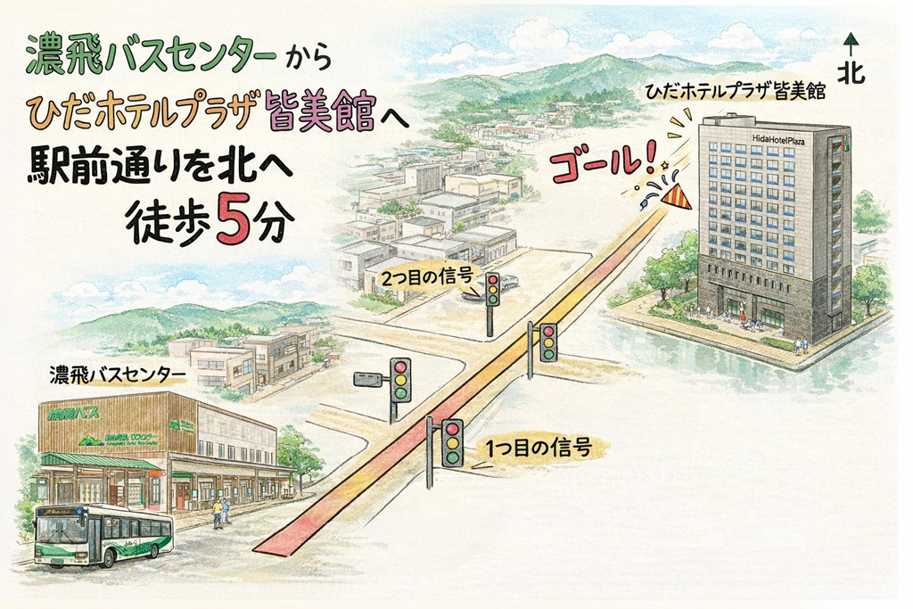 飛騨高山温泉 ひだホテルプラザ(皆美館)入口 までは、徒歩約5分。