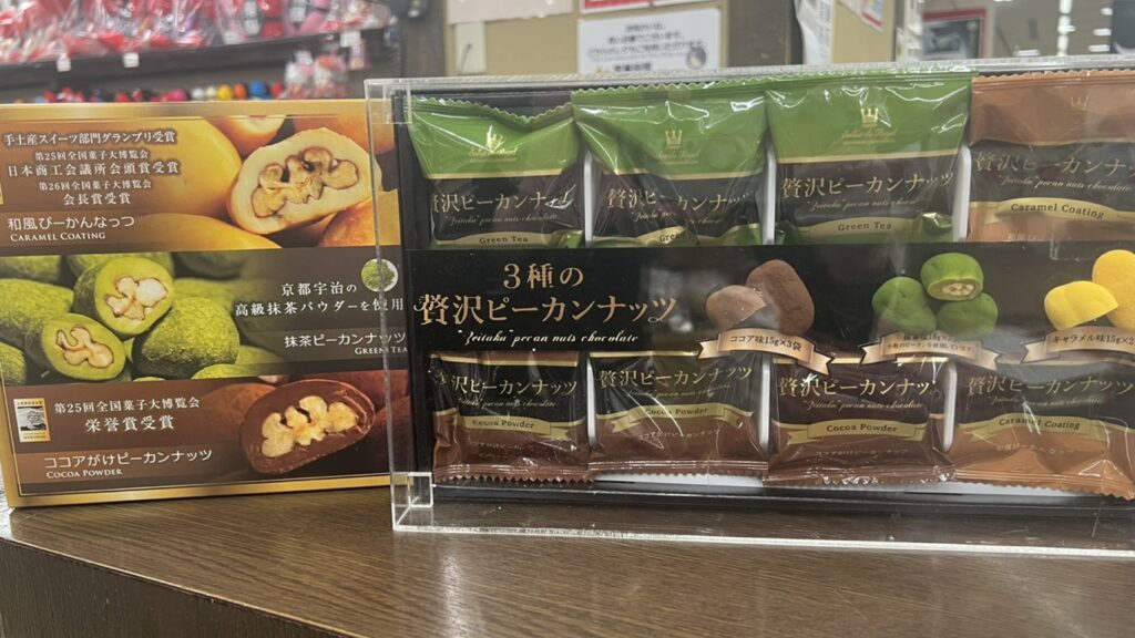 ・ホワイトチョコレートを使用した和風ぴーかんなっつ・高級抹茶パウダーを使用の抹茶ピーカンナッツ・ミルクチョコレートを使用した、ココアがけピーカンナッツ。3種類の味をお楽しみいただけます。