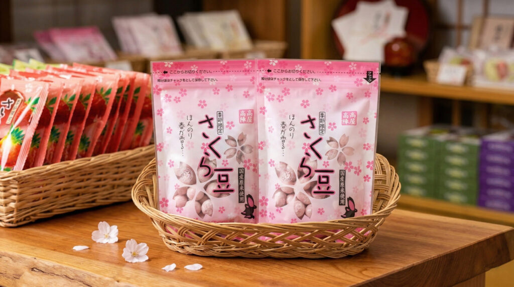 創業明治二十三年「打保屋」春の限定商品です。落花生と国産の桜葉を使用しており、一粒で桜が香るほんのり甘いお菓子です。